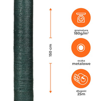 Tkanina osłonowa, mata 180 g/m2, zielona, 80% zacienienia. Na balkony, tarasy, ogrodzenia. Odporna na warunki atmosferyczne, promieniowanie UV. Wyposażona w metalowe oczka. Wymiary: wysokość 1,5 m, długość 25 m.