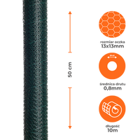Siatka sześciokątna, ocynkowana, powlekana PVC, w kolorze zielonym, wys. 0,5 m, długość rolki 10 m. Oczko 13x13 mm. Średnica drutu 0,8 mm.