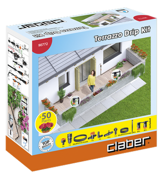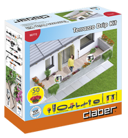Kompletny zestaw do nawadniania roślin tarasowych lub rosnących na klombach Terazzo Drip Kit, producent Claber, model 90772. Zawiera wszystko, co potrzebne do skonfigurowania systemu nawadniającego przeznaczonego do nawadniania do 50 roślin.