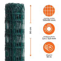 Siatka metalowa, ozdobna, pleciona, powleczona PCV. Wysokość 0,9 m, długość rolki 10 m, kolor zielony. Zastosowanie: ogrodnictwo, ochrona i dekoracja rabat.