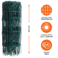 Siatka metalowa, ozdobna, pleciona, powleczona PCV. Wysokość 0,4 m, długość rolki 25 m, kolor zielony.