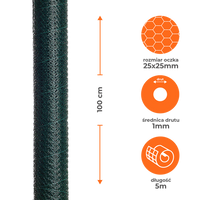 Siatka sześciokątna, ocynkowana, powlekana PVC, w kolorze zielonym, wys. 1 m, długość rolki 5 m. Oczko 25x25 mm. Średnica drutu 1 mm.