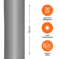 Tkanina osłonowa, mata 180 g/m2, 80% zacienienia. Na balkony, tarasy, ogrodzenia. Odporna na warunki atmosferyczne, promieniowanie UV. Wyposażona w metalowe oczka. Wymiary: wysokość 1 m, długość 25 m.