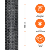 Tkanina osłonowa, mata z technorattanu 650g/m2, szara, 80% zacienienia. Na balkony, tarasy, ogrodzenia. Odporna na warunki atmosferyczne, promieniowanie UV. Wyposażona w metalowe oczka. Wymiary: wysokość 1,2 m, długość 3 m.